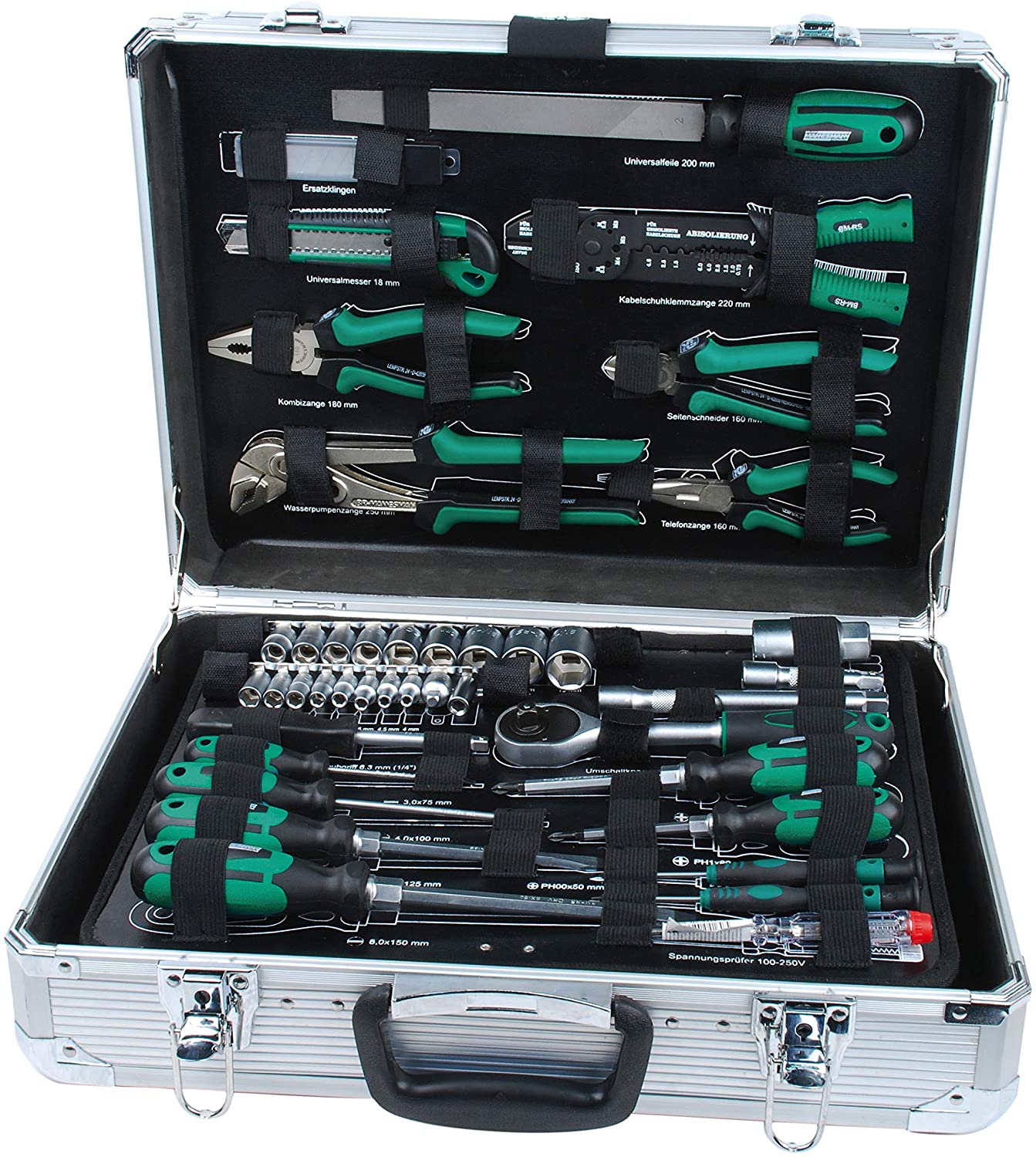 Der Brüder Mannesmann M29075 Alu-Werkzeugkoffer bietet eine preisgünstige Möglichkeit, um das eigene Werkzeugsortiment zu erweitern. Der Koffer enthält ein breites Spektrum an nützlichen Werkzeugen und ist ideal für den privaten Gebrauch geeignet. Dabei zeichnet sich der Koffer durch seine Stabilität sowie die übersichtliche Sortierung des Inhalts aus.
