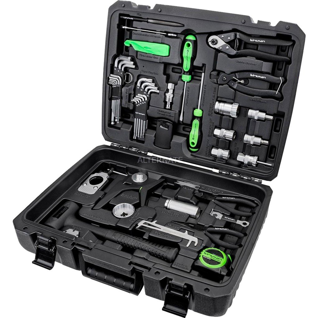 | Inhalt | Torx-Set T10-T50, Innensechskant-Set 1,5-10mm, Kettenmesslehre, Flickzeugset, Reifenheber-Set, Shimano Cartridge Innenlager-Werkzeug, Kurbelabzieher, Kabelschneider, Hollowtech I, Innenlager-Werkzeug, 1/2“ Ratsche, Kurbelarm Werkzeug, Spoke Wrench 12G-15G/Shimano 4,3/4,4, Kettennieter 9-11fach, Pedalschlüssel, Kettenpeitsche 8-11fach, Langschlitz- u. Kreuzschlitz Schraubendreher, Gabelschlüssel 8+10mm, Feile, Kettenzange, Kassettenschlüssel Shimano HG, MF und Campa, Innensechskant 8+10mm, verstellbarer Schraubenschlüssel, Kolbendrücker, Bremsscheibenrichter, Scheibenbrems-Lehre, Gabelschaftschneider 1“ 1.1/8“ 1.1/4“, Mavic Speichen Werkzeug, Krallenmutter Einschlagwerkzeug, Greifzange, Kettenblatt-Schraubenschlüssel, Kneifzange, Gummihammer, Maßband |