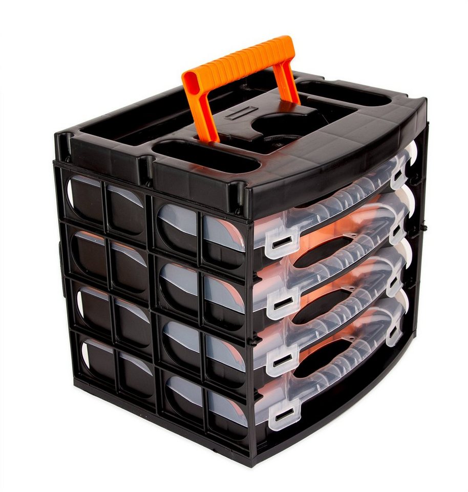 BigDean Werkzeugkoffer Sortierkasten mit 4 herausnehmbaren Schubladen Sortimentskasten - Flexibles OrdnungssystemKunststoff, schwarz, orange, transparent