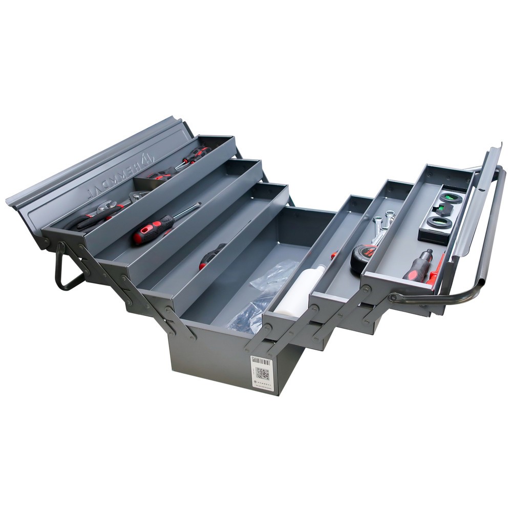Dieser Werkzeugkasten bietet eine geräumige Aufbewahrungslösung mit vielen Fächern, die es ermöglichen, Werkzeuge übersichtlich und sicher zu verstauen. Dank der robusten Verarbeitung ist er beständig gegenüber den Herausforderungen des Alltags in Werkstätten oder beim Heimwerken. Zudem sorgt die Möglichkeit zur Versperrung für zusätzlichen Schutz Ihrer wertvollen Utensilien.