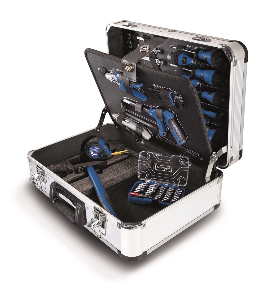 Der Werkzeugkoffer TB150 von Scheppach bietet eine Vielzahl an hochwertigen und stabilen Werkzeugen, die alle notwendig sind, um den Bedürfnissen eines normalen Heimwerkers gerecht zu werden. Der Koffer selbst ist aus Aluminium gefertigt und überzeugt durch seine hohe Qualität sowie gute Organisation der Werkzeuge. Zudem verfügt er über ein praktisches Fach für verschiedene Utensilien und bietet somit ein umfangreiches Werkzeugset.