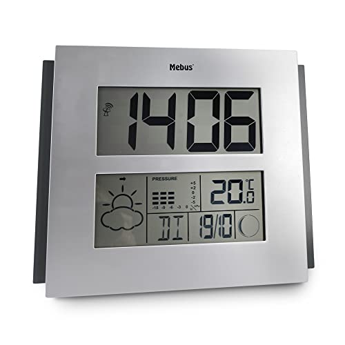 Mebus digitale Funk-Wetterstation extragroß für Wand oder Tischmit Wettervorhersage, Barometer, Mondphasen, Kalender und Weckfunktion/Alarm, gut lesbar/Farbe: Silber-Schwarz/Modell: 40330