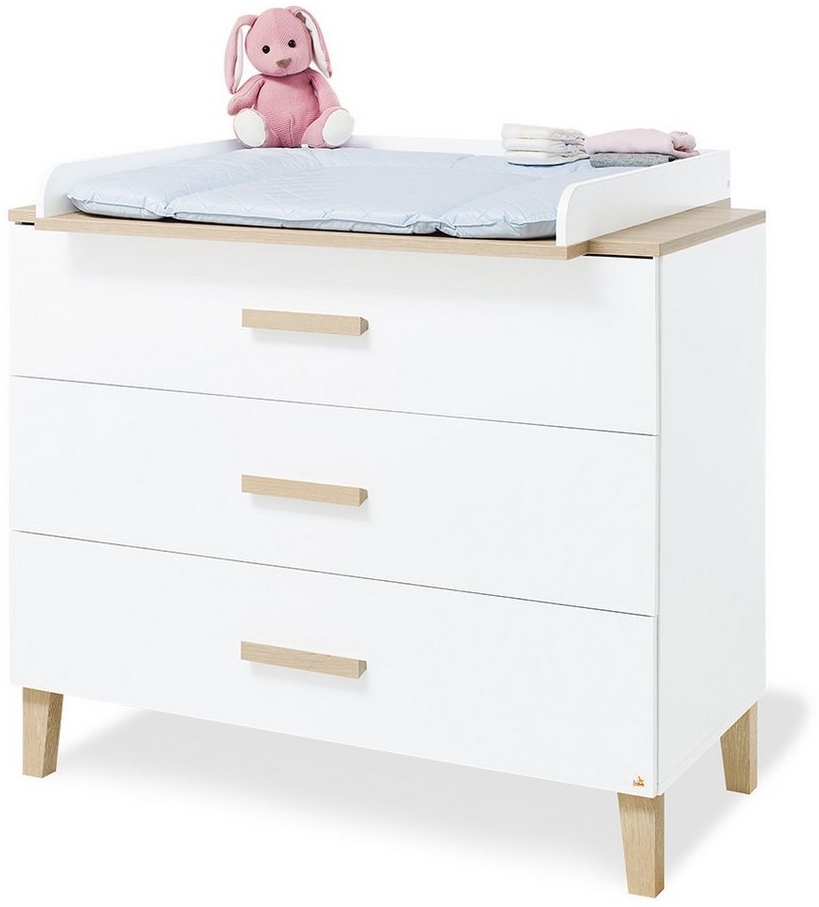 Die Pinolino 'Lumi' Wickelkommode ist die ideale Lösung für das Kinderzimmer. Mit abnehmbarem Wickelaufsatz, Self-Soft-Close und 3 geräumigen Schubkästen bietet sie genügend Stauraum für Wickelutensilien und Kleidung. Die Kommode in Uni Weiß und Eiche mit Echtholzstruktur hat Maße von B 110 x T 77 bzw. 56 x H 101 cm (Wickelhöhe 93 cm). **Highlights** - Abnehmbarer Wickelaufsatz: Flexibilität beim Aufstellen - Self-Soft-Close-System: Leises und sicheres Schließen der Schubkästen - Variabler Aufsatz: Links, mittig oder rechts montierbar - Vielseitige Nutzung: Auch als Sideboard verwendbar - Großer Stauraum: 3 geräumige Schubkästen für Wickelutensilien und Kleidung **Produkteigenschaften** - Maße: B 110 x T 77 bzw. 56 x H 101 cm (Wickelhöhe 93 cm) - Dekor: Uni Weiß und Eiche mit Echtholzstruktur - 3 Schubkästen für optimale Aufbewahrung - Abnehmbarer Wickelaufsatz für flexible Nutzung - Selbstschließende Schubkästen für Sicherheit - Variabel montierbarer Aufsatz für individuelle Anpassung - Vielseitige Verwendung als Wickelkommode oder Sideboard