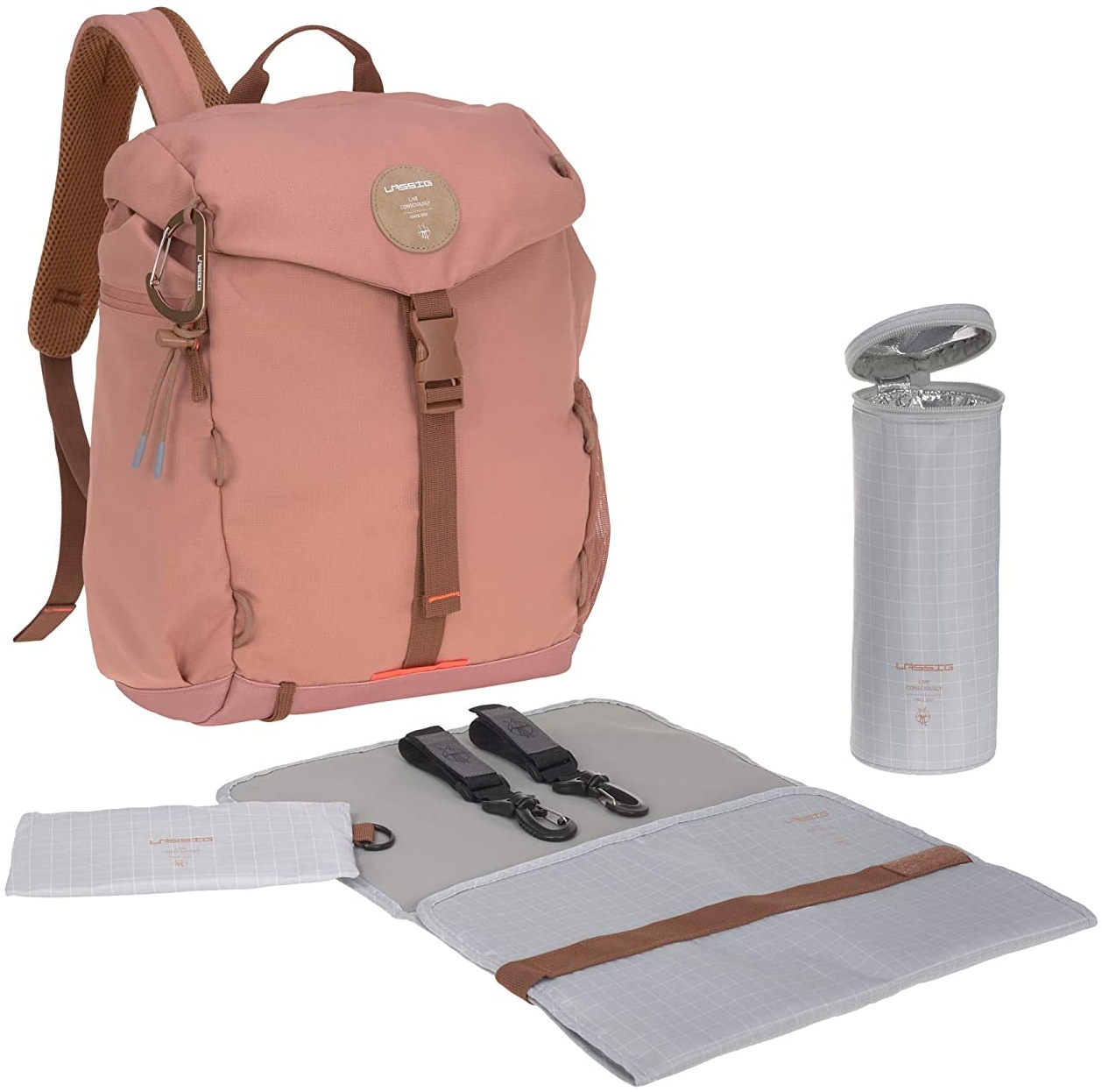 Lässig Wickelrucksack Outdoor Backpack Mit dem schlichten und nachhaltigen Lässig Wickelrucksack Outdoor Backpack steht dem nächsten Ausflug ins Grüne nichts mehr im Wege. Auch im Alltag ist der Wickelrucksack ein toller Begleiter mit umfangreichem Zubehör. Sein durchdachtes Design und seine Funktionalität machen ihn zum absoluten Must have für aktive Familien. Die gepolsterte Rückenparte sorgt dank Lüftungskanälen und Mesh Stoff für eine gute Luftzirkulation. Noch mehr Komfort bieten der höhenverstellbare Brustgurt und die verstellbaren, ergonomisch geformten und gepolsterten Schulterriemen. Mit seinem integrierten neonfarbenen Regenschutz und der verstellbaren Jackenhalterung und einem Karabiner macht er sogar die wildesten Abenteuer bei Wind und Wetter mit. Reflektierende Elemente sorgen für Sichtbarkeit bei Dunkelheit. Das Außenmaterial ist robust und zusätzlich wasserabweisend und sorgt dafür, dass man lange Freude hat. Ein gut durchdachtes Innenleben, Staufächer innen und außen sowie das umfangreiche Wickelzubehör runden den Rucksack ab. Ausgestattet mit einer wasserabweisenden Wickelunterlage, einem isolierten Flaschenhalter, einer herausnehmbaren Gläschenhalterung, Kinderwagenhaken und einer kleinen Utensilientasche hat man alles, was man unterwegs braucht. Produkthighlights: • Wickelunterlage • Kinderwagenbefestigung • Utensilientasche • isolierter, herausnehmbarer Flaschenhalter • wasserabweisendes Feuchtfach • seitliches Außenfach für Flasche • Regencover • Reflektoren • höhenverstellbarer Brustgurt • Rückenpolsterung mit Mesh & Padding • Ösen und Befestigungsschlaufen für Utensilien • Jackenhalterung aus Polyester • Innenfutter aus recyceltem Polyester Technische Daten: • Innematerial: 100% Polyester (aus recyceltem Material) • Außenmaterial: 100% Polyester • Abmessungen: 28 x 16 x 42 cm • Gesamtgewicht: 0,85 kg • Fassungsvermögen: 17,7 Liter