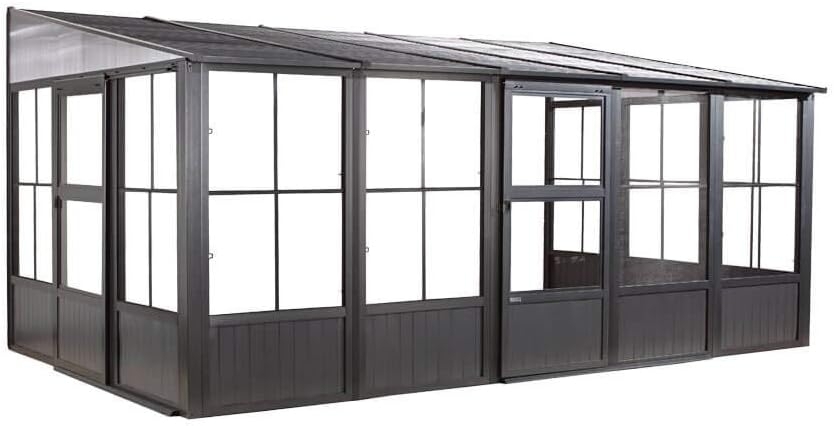 **Sojag Aluminium Pavillon und Wintergarten Mural 1016 | Anthrazit | 309x502 cm** Der SOJAG Premium Aluminium Pavillon Wintergarten Mural 10x16 mit Hard Top besticht durch seine moderne Optik und Langlebigkeit. Das Dach aus galvanisiertem Stahl bietet eine außergewöhnliche Schneelast von 150kg/m². Die pulverbeschichtete Aluminiumkonstruktion ist rostfrei und für ganzjährigen Außenbetrieb geeignet. Mit kontrollierbarer Durchlüftung und einfachem Aufbau. **Highlights** - Dach aus galvanisiertem Stahl für hohe Schneelasten - Inklusive Fenstern und Moskitonetzen für Durchlüftung - Pulverbeschichtete und rostfreie Aluminiumkonstruktion - Modernes Design und langlebige Materialien - Geeignet für ganzjährigen Außenbetrieb **Produkteigenschaften** - Maße: 309x502 cm - Material: Aluminium und galvanisierter Stahl - Schneelast: 150kg/m² - Fenster mit Moskitonetzen - Pulverbeschichtete Aluminiumkonstruktion - Einfacher Aufbau mit detaillierter Anleitung - Empfohlener Untergrund: Holz, Beton oder Pflastersteine - 5 Jahre Herstellergarantie gegen Durchrostung