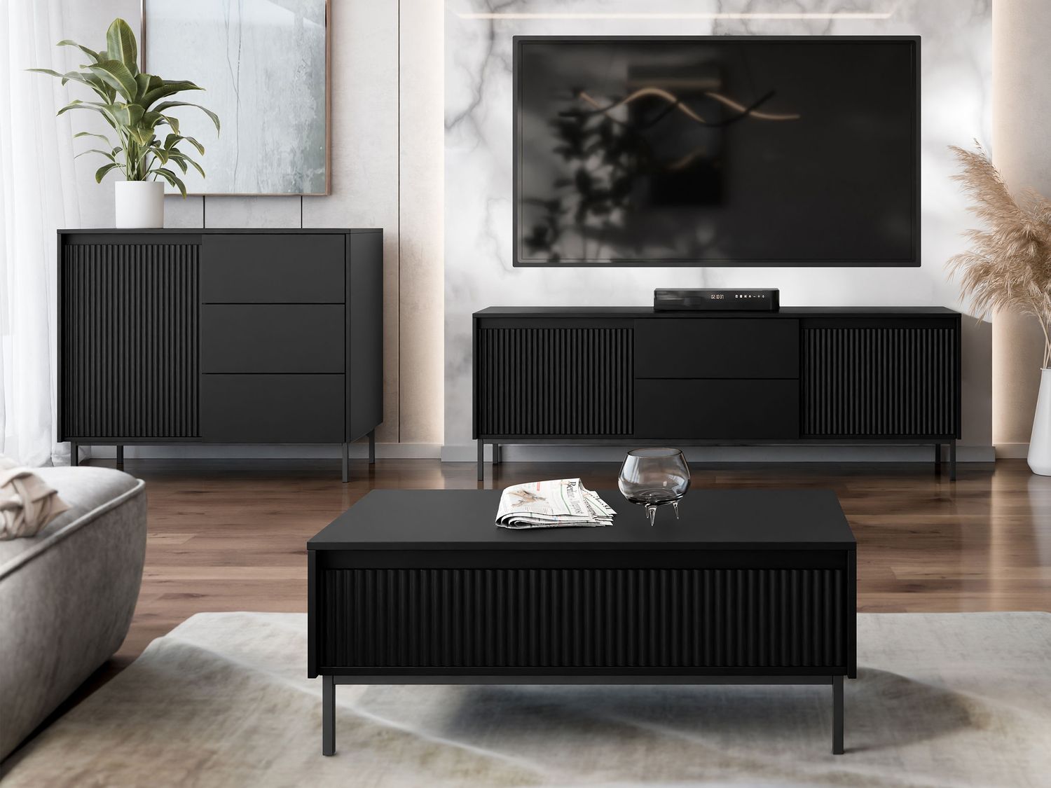 Das Wohnzimmer-Set Ozmi II besteht aus einer Kommode, einem TV-Lowboard und einem Couchtisch in der eleganten Farbe Schwarz. Die Möbel sind aus hochwertigen Materialien gefertigt und bieten durch das griffloses Öffnungssystem eine moderne Handhabung. Alle Teile sind in ansprechenden Abmessungen gestaltet, die sich ideal in Ihr Wohnambiente einfügen. **Highlights** - Griffloses Öffnungssystem push to open für einfachen Zugriff - Korpus aus stabiler Laminatplatte (16 mm) für Langlebigkeit - Fronten aus MDF-Platte (18 mm) für eine ansprechende Optik - Untergestell aus Metall in Schwarz für zusätzliche Stabilität - Kugelgleitschienen für sanftes Öffnen und Schließen **Produkteigenschaften** - Kommode Ozmi 1D3SZ: Breite 103 cm, Höhe 90 cm, Tiefe 50 cm - TV-Lowboard Ozmi 2K2SZ: Breite 174 cm, Höhe 60 cm, Tiefe 40 cm - Couchtisch Ozmi 1SZ: Breite 100 cm, Höhe 40 cm, Tiefe 50 cm - Rücken aus HDF-Platte - ABS-Rand für zusätzlichen Schutz - Scharniere FI35 **Lieferumfang** - Kommode Ozmi 1D3SZ - TV-Lowboard Ozmi 2K2SZ - Couchtisch Ozmi 1SZ - Montageanleitung - Lieferung bis zur ersten Tür (keine Lieferung auf Inseln oder in Bergbewohnung) - Ohne Dekoration