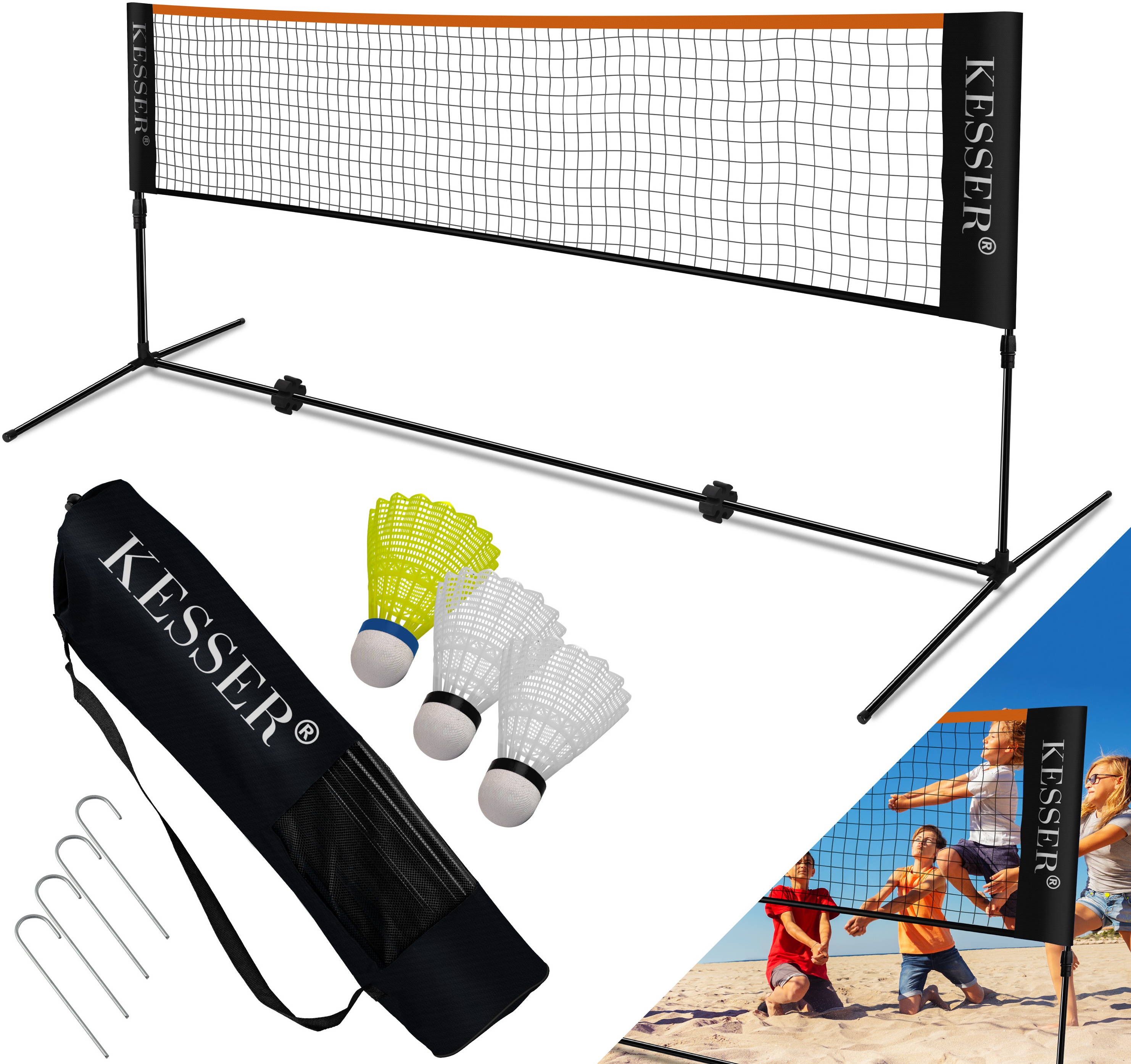 KESSER Badminton-Netz hochwertig und robust, höhenverstellbar sowie multifunktionell für harte und weiche Böden und perfekt für Kinder und Erwachsene Das Multi-Talent für jeden Schlag - und Ballsport - das dreifach höhenverstellbare Kombi-Sport-Netz von KESSER! Das multifunktionelle Sportnetz hat solide Kunststoff-Verbinder und eine stufenlose Höhenverstellung damit Sie auswählen können, ob Sie lieber ein Federballspiel starten oder stattdessen Tennis, Beachball, Volleyball oder Beach Soccer spielen wollen. Das Badminton-Ständer-Set besteht aus einer stabilen Struktur, bestehend aus einer unteren Stange, zwei seitlichen Pfeifen und einer mittleren Stützstange, die dafür sorgen, dass sich das Tennisnetz vollständig ausdehnt und nicht herunterfällt. Vier Bodennägel sorgen für eine zusätzliche Stabilität. Unser tragbares Outdoor und Indoor Trainingsnetz ist ein multifunktionelles Sportnetz, das auf verschiedene Höhen von 92cm auf bis maximal 155cm eingestellt werden kann und so die Bedürfnisse von Kindern und Erwachsenen miteinander kombiniert. Mit soliden Standfüßen und dem einfachen Aufbau bietet es alle Eigenschaften, die für ein sicheres Ballspiel wichtig sind. Die andersfarbig markierte Netzkante macht das Spielgitter sehr gut sichtbar und lässt Sie punktgenau zielen. Das Ändern der Netz Höhe ist einfach: Klinken Sie die Rohre auf der richtigen Höhe ein und schon geht es los! Nach der Sporteinheit lässt sich das faltbare und leichte Sport Tool einfach verstauen und wird in der inbegriffenen großen Transporttasche unkompliziert verstaut. Das Freizeitspielgerät hat ein doppeltes Netz-Spannsystem, um sicherzustellen, dass es stets straff gespannt bleibt. Die horizontale Metallrohr-Verbindung im Boden des Gitters erstreckt sich von einer Seite zur anderen. **Produkt-Highlights:** - Multifunktionell einsetzbar für verschiedene Ballsportarten - Höhenverstellbare Netz Höhe, 107cm für Tennis, 120cm für Kinder, 155cm für Erwachsene - Für Groß und Klein perfekter Spielgenuss - Federleicht und platzsparend zu verstauen - Perfekt für Indoor und Outdoor - Transportabel - Ideale Urlaubsbegleitung - bis 150 kg belastbar - Premium Qualität - Sicherheit - Fester Stand durch stabile und robuste Verarbeitung - Mit Befestigungsnägeln für weiche Böden - Langlebigkeit durch qualitativ hochwertige Materialien - Für Hinterhof, Spielwiese, Campingplatz, Garten und Strand **Technische Daten:** - Tiefe: 103cm - Breite : 300cm - 3-Fach-Höhenverstellbar: Höhe: 107/120/155cm - Material: Netz: Nylon/Stützrohre aus lackiertem Eisen - Belastbarkeit bis 150kg **Lieferumfang:** - 1x Badmintonnetz - 2x Haltestangen - 1x Transporttasche - 3x Federball - 4x Erdhaken MULTIFUNKTIONELL: Dank der Höhenverstellung des Netzes können Sie wählen auf welche Ballsportart Sie und Ihre Lieben gerade Lust haben! Federball, Volleyball, Badminton, Beachball und Soccer – mit unserem KESSER Multisportnetz ist alles möglich und Sie können viele verschiedene Lieblingssportarten genießen! STABILE KONSTRUKTION: Das Badminton-Ständer-Set besteht aus einer recht stabilen Struktur, bestehend aus einer unteren Stange, zwei seitlichen Pfeifen und einer mittleren Stützstange, die dafür sorgen, dass sich das Tennisnetz vollständig ausdehnt und nicht herunterfällt. Es kann auf weicher oder harter Oberfläche wie Strand, Beton, Hinterhof, Park, Turnhalle, Rasen, Park oder Wiese verwendet werden. Die mitgelieferten Befestigungsnägel helfen Ihnen dabei Ihr Sportspielzeug optimal auf weichem Untergrund zu befestigen. EINFACHER AUF – UND ABBAU: Für mehr Spontanität! Sie müssen dieses Badminton-Netz nur auf der Wiese oder auf einer anderen Fläche wie Hinterhof, Strand, Park aufstellen, es steht mit seinen stabilen Standfüßen oder den mitgelieferten Befestigungsnägeln fest allen Böden und ist kinderleicht auf - und abzubauen. Spontan oder auch geplant: Ruckzuck parat! SPIELSPASS FÜR KLEIN UND GROSS: Sportliebhaber in jedem Alter kommen hier auf Ihre Kosten und können gemeinsam dribbeln, schlagen, kicken und punkten! Länge und Höhe sind so variabel, dass Sie gemeinsam mit Ihren Kindern das Spielvergnügen genießen können, stellen Sie Ihr Spielgerät dazu variabel von mindestens 92cm auf maximal 155cm für Ihre Bedürfnisse ein. 107cm ist dabei eine perfekte Höhe für Tennis, 120cm für mitspielende Kinder und 155cm für jegliche Schlag - und Ballspiele. PREMIUM QUALITÄT: Das Badminton-Netz besteht aus hochwertigem Nylon, die Stützrohre aus lackiertem Eisen, das rostfrei und langlebig genug ist, um eine lange Lebensdauer zu gewährleisten. Spiel, Satz und Sieg - unser hochwertiges Premium Soccer – Badminton Set ist federleicht und punktet genau.