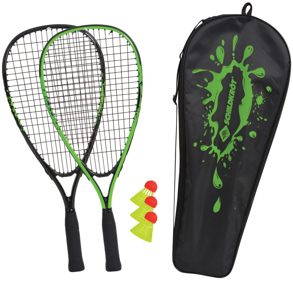 Speed-Badminton pur: Das neue Speed-Badminton Set von Schildkröt kommt inklusive 3er Dose Bälle und in einer praktischen Tasche mit Tragegurt. Die sehr handlichen Schläger (Länge 54,5cm, Gewicht 165g, Rahmenprofil 17,3mm) sind 4cm kürzer als das normale Speed-Badminton Racket und dadurch deutlich handlicher; Anfänger, Freizeit-Spieler aber auch Kinder haben mit diesem Set wesentlich mehr Freude und ein schnelleres Erfolgserlebnis! Speed-Badminton (oft auch als Crossminton bezeichnet) ist das wohl vielseitigste Rückschlagspiel der Welt! Gespielt wird am Strand, im Park oder Garten - ganz ohne Netz. Das Besondere an Speed-Badminton ist die Windstabilität - wer kennt nicht die frustrierenden Versuche, bei leichtem Wind Federball zu Spielen? Der windstabile Speed-Badminton Ball ist schwerer und kleiner als ein normaler Federball und bringt dabei ein Extra an Speed.