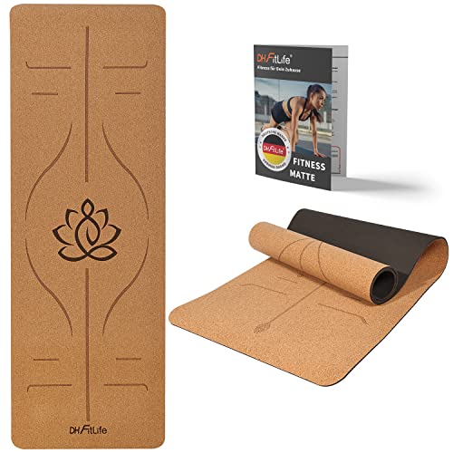 DH FitLife Yogamatte aus Kork & TPEGymnastikmatte 183 x 61 x 0,6 cm, Fitnessmatte rutschfest & umweltfreundlich, selbstreinigend - Yoga Matte mit Orientierungslinien (großer Lotos)
