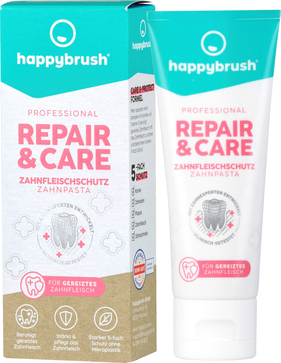 Laut der Testerinnen und Tester punktet die Happybrush Professional Repair & Care Zahnpasta mit einer sehr guten Kariesprophylaxe und der Vermeidung von Titandioxid. Die Verfärbungsentfernung wird allerdings nur als befriedigend bewertet. – zusammengefasst durch die Testsieger.de-Redaktion
