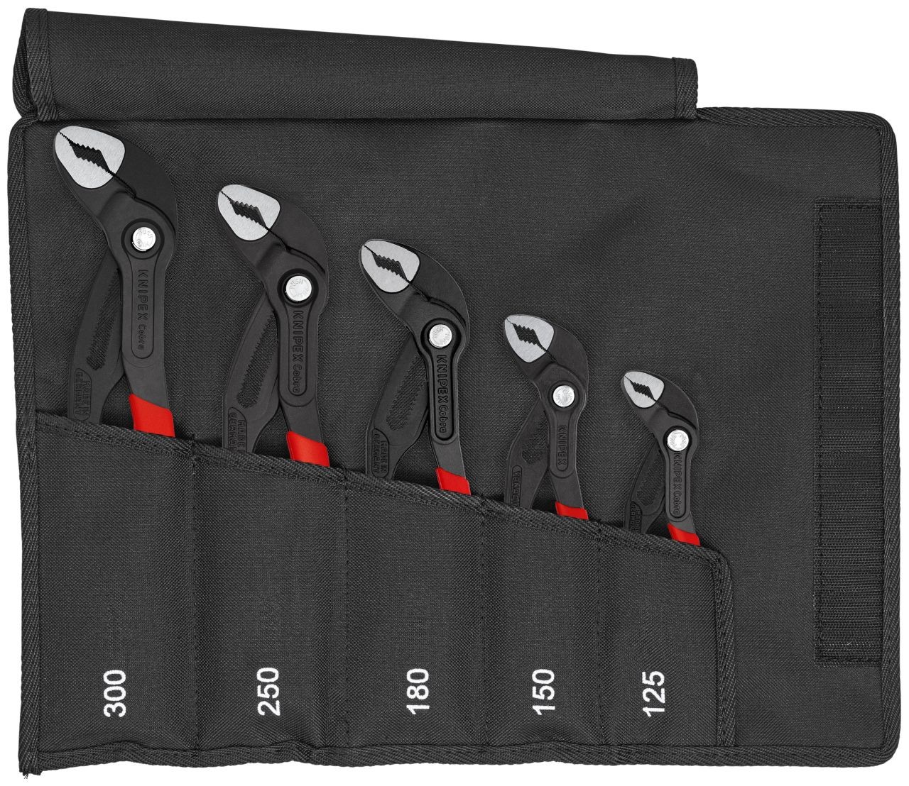 Das KNIPEX 00 19 55 S5 Cobra-Set besteht aus fünf verschiedenen Zangen mit einer Länge von jeweils 333 mm. Die Zangen sind gut verarbeitet und bieten für jeden Zweck die passende Greifmöglichkeit. Dank der Gummibeschichtung an den Griffen liegt das Set auch bei schwierigen Arbeiten sicher in der Hand und schützt vor Abrutschen.
