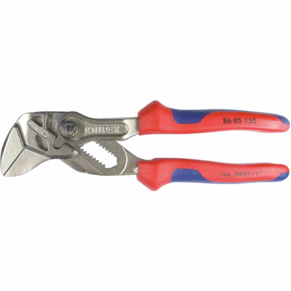 Der KNIPEX 86 05 150 Zangenschlüssel ist ein Werkzeug, das eine Zange und einen Schraubenschlüssel in einem vereint. Die Mehrkomponenten-Hüllen sorgen für einen sicheren Griff während der Anwendung. Der Nutzen dieses Produkts liegt darin, dass es Zeit und Platz spart, da man nicht mehrere Werkzeuge mitnehmen oder suchen muss. Durch das stabile "Einrasten" der Zangenbreite und die glatten Greifbacken kann jederzeit präzises Arbeiten gewährleistet werden.